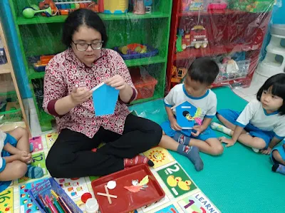 Anak-anak melatih motorik halus dan seninya dengan melipat kertas origami membentuk binatang kucing.